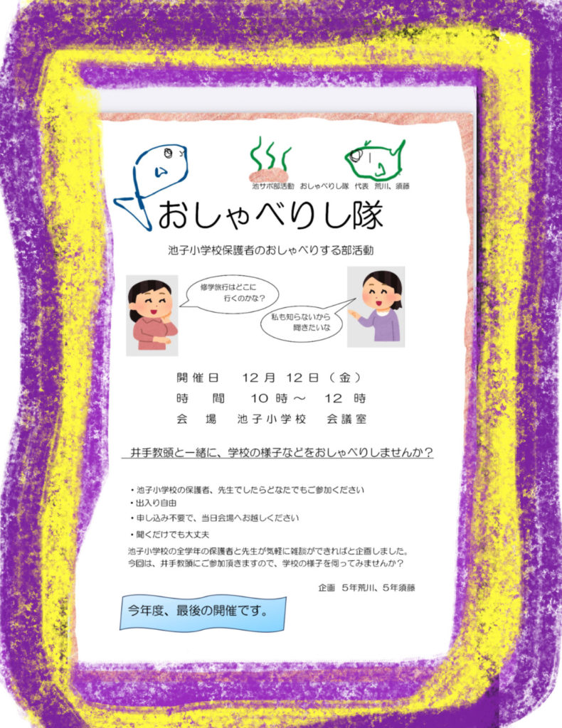 池子小学校の保護者が、先生や仲間と気軽におしゃべりできる時間☺️ 12月12日(金)10時〜12時 池子小学校 会議室にて開催🎈 今回は井手教頭先生もご参加くださいます! 学校のこと、子どもたちの様子、なんでも気軽にお話 […]
